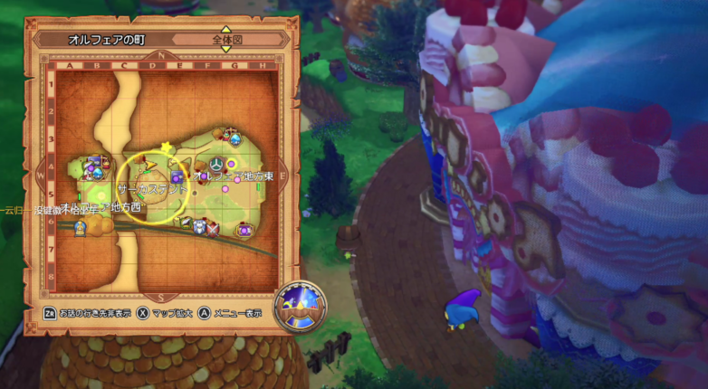 ▲欧鲁非亚镇 --> 回到欧鲁非亚镇,进入马戏团后台“楽屋”,触发剧情。 --> 剧情后团长请求玩家前往ミュルエルの森当中的フォステイル広場,一起击败恶魔。出发前建议整顿一下装备。 |