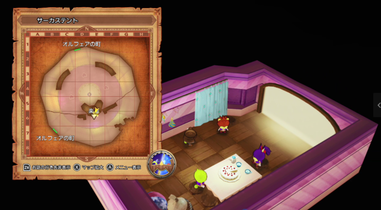 ▲抵达欧鲁非亚镇 --> 首次进入欧鲁非亚镇,城镇门口布丁族的ハーボッボ告诉玩家,城镇的特色是中央的大马戏团。 --> 进入大马戏团正门,触发剧情,孩子们都被团长抓走了。 --> 进入大马戏团后门,触发剧情。剧情后进入马戏团后台“楽屋”,对话后知道团长可能去银之丘了。 ![]() 马戏团正门 ![]() 马戏团后台“楽屋” |