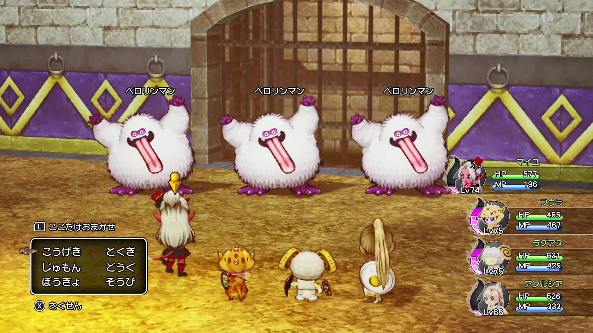 支线No.273:真偽 接受条件:完成支线No.272 接受地点:真グランゼドーラ城的「秘密会議室」 (1)在真グランゼドーラ城的「秘密会議室」,调查绿色的椅子,跟贤者ブロッゲン接受任务。 (2)前往真のアラハギーロ王国的怪物格斗场(モンスター格闘場)。 (3)跟格斗场门前的ナダーフ对话,选择“是”,进入试炼战斗:「ベロリンマン」。注:战斗经过1个回合后触发剧情,剧情结束后再次进入战斗,强制要求把勇者公主编入队伍当中,战斗中使用勇者公主的必杀技勇者之眼,抵消BOSS的幻影后再进行攻击。 (4)战斗胜利后触发剧情,勇者公主学会「勇者の眼」。 (5)返回真グランゼドーラ城的「秘密会議室」,触发剧情,完成任务。 ![]() 怪物格斗场门前的ナダーフ ![]() BOSS「ベロリンマン」及其幻影 |